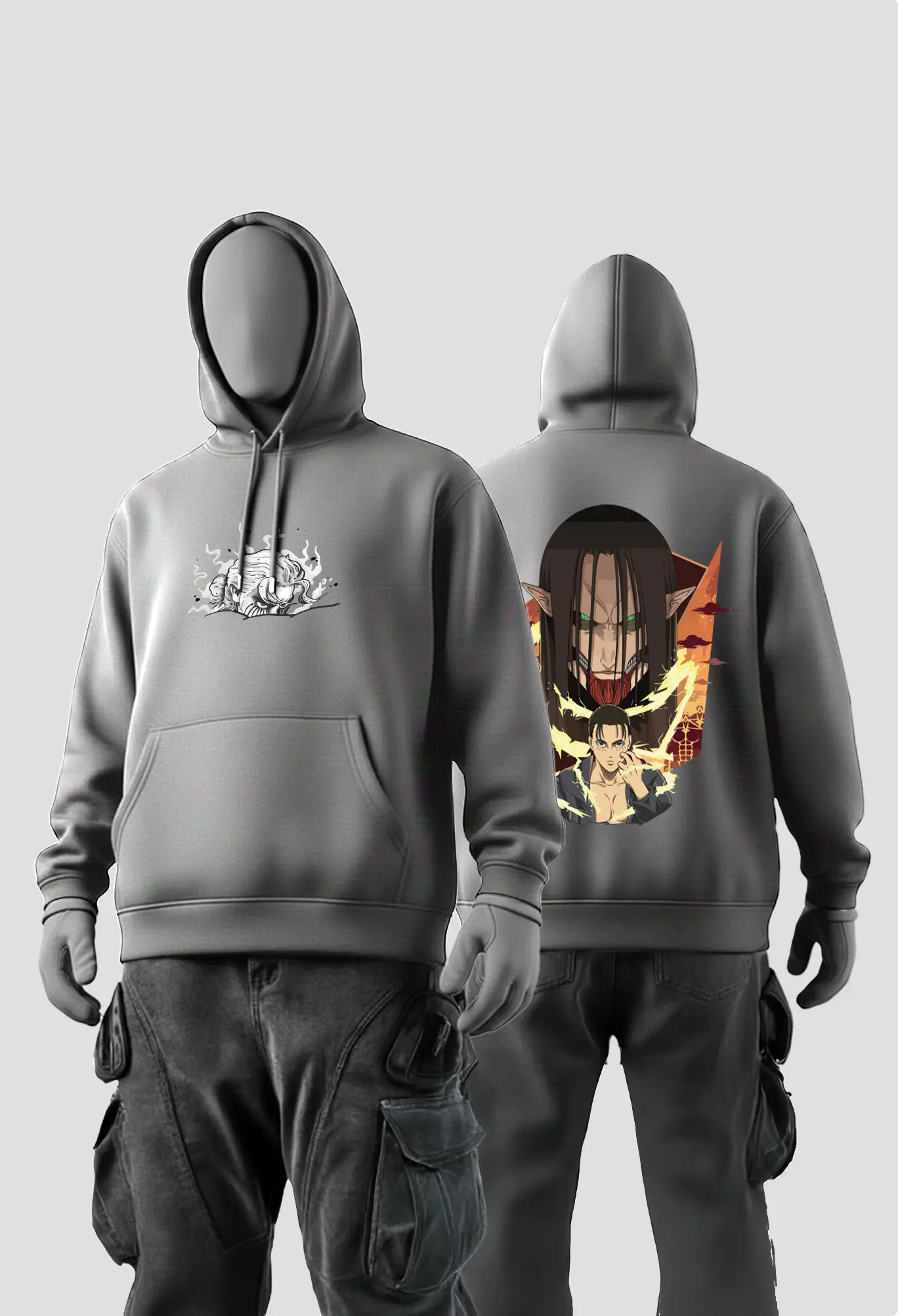 Back Design: Full portrait of Eren Yeager with his Titan form in the background — symbolizing duality and vengeance.