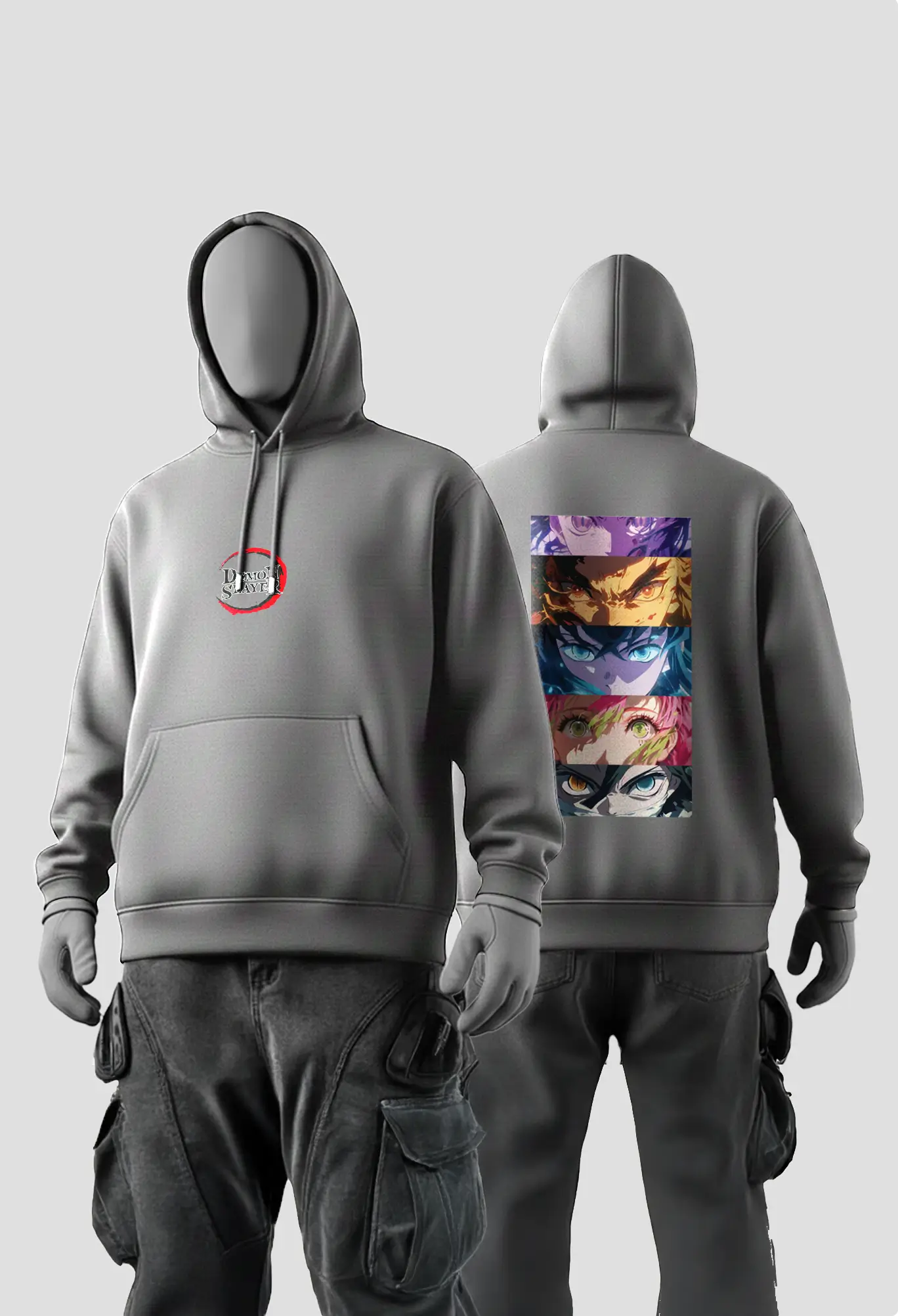 Back Design: Full high-detail panel featuring the iconic Hashira eye strip — Giyu, Rengoku, Shinobu, Mitsuri and Muichiro — illustrated in a bold manga style.