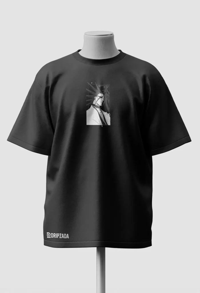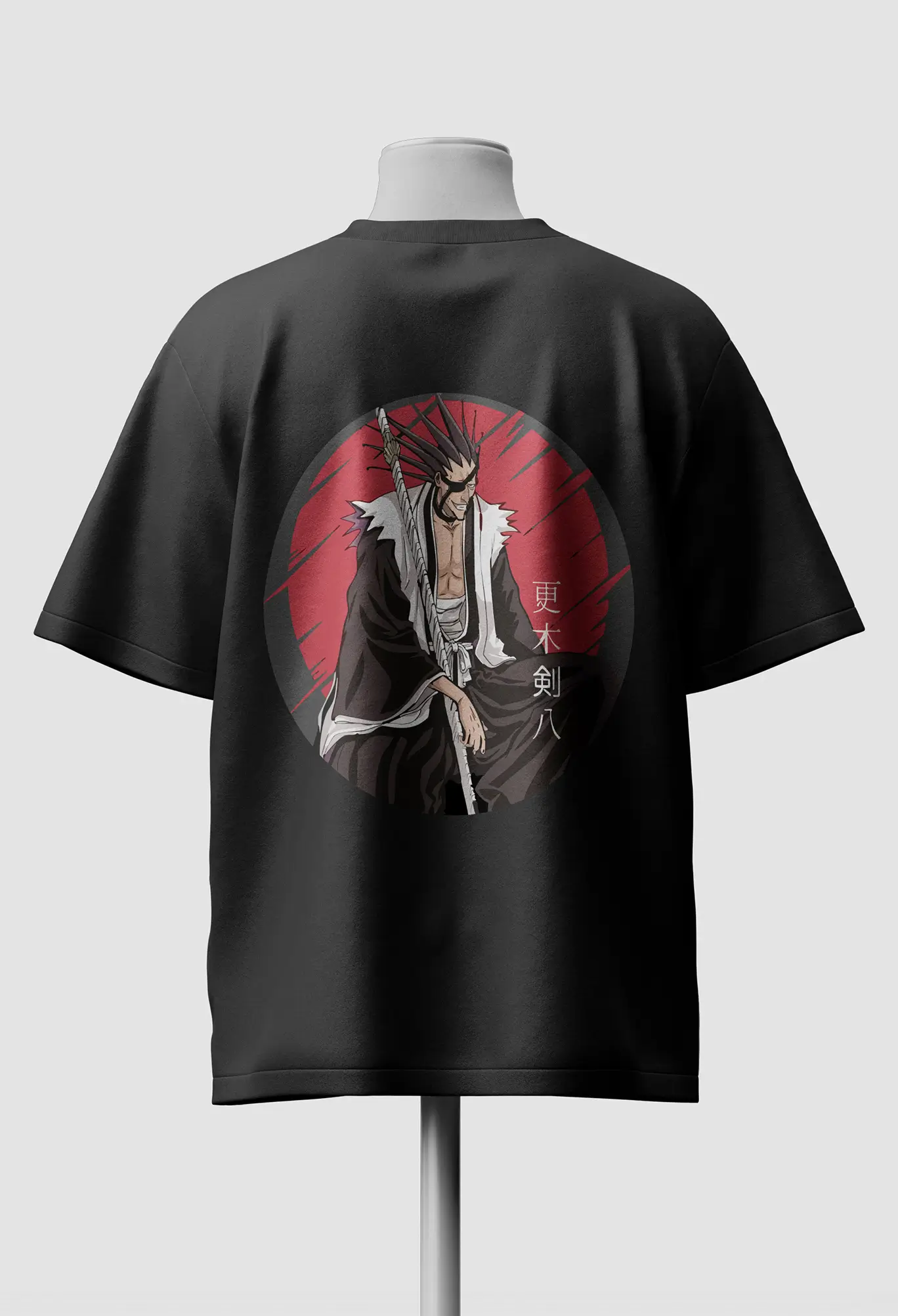 The Kenpachi Zaraki Oversized T-Shirt captures Bleach’s strongest captain. The front carries a bold monochrome Kenpachi portrait, while the back explodes with his menacing stance against a blood-red backdrop.